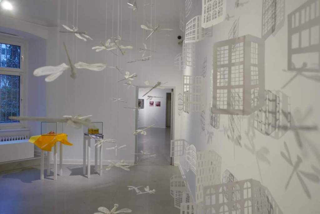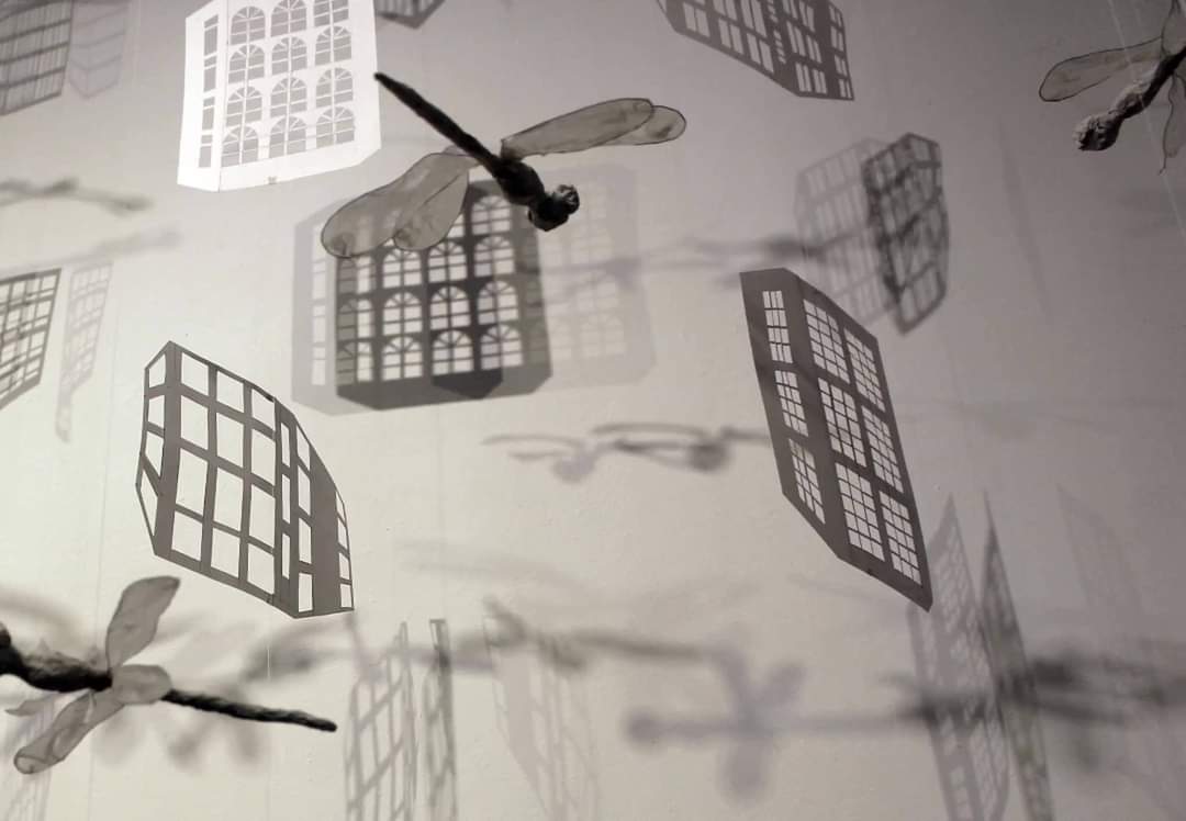 Die Installation „Thaischatten“ entstand 2014 nach meiner zweimonatigen Reise mit dem Rucksack durch Thailand. „Thaischatten“ hängt an vielen Schnüren unter der Raumdecke an einem Gitter aus feinen Stäbchen. Die Papierhäuser befinden sich ca. 1cm über dem Boden und sind beweglich ( „schwimmen“ optisch). Die Installation wird mit einem Ventilator in leichter, ständiger Bewegung gehalten und von einer Lichtquelle angeleuchtet. Die Schattenrisse bilden sich als Schatten an der Wand ab.