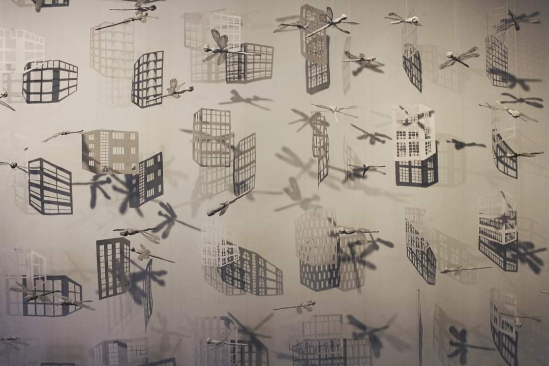 “Babel” ist eine in sich bewegliche Installation – bestehend aus ca 400 nummerierten Papierobjekten (in Häuserformen). Die Installation ist ein in sich bewegliches Mobile und ca. 3,50 hoch. Sie wird von zwei Lichtquellen beleuchtet und erzeugt an der Wand ein sich ständig veränderndes Schattenspiel, in dem immer neue Formen aufeinandertreffen, sich verbinden, überlagern und wieder auseinanderdriften.